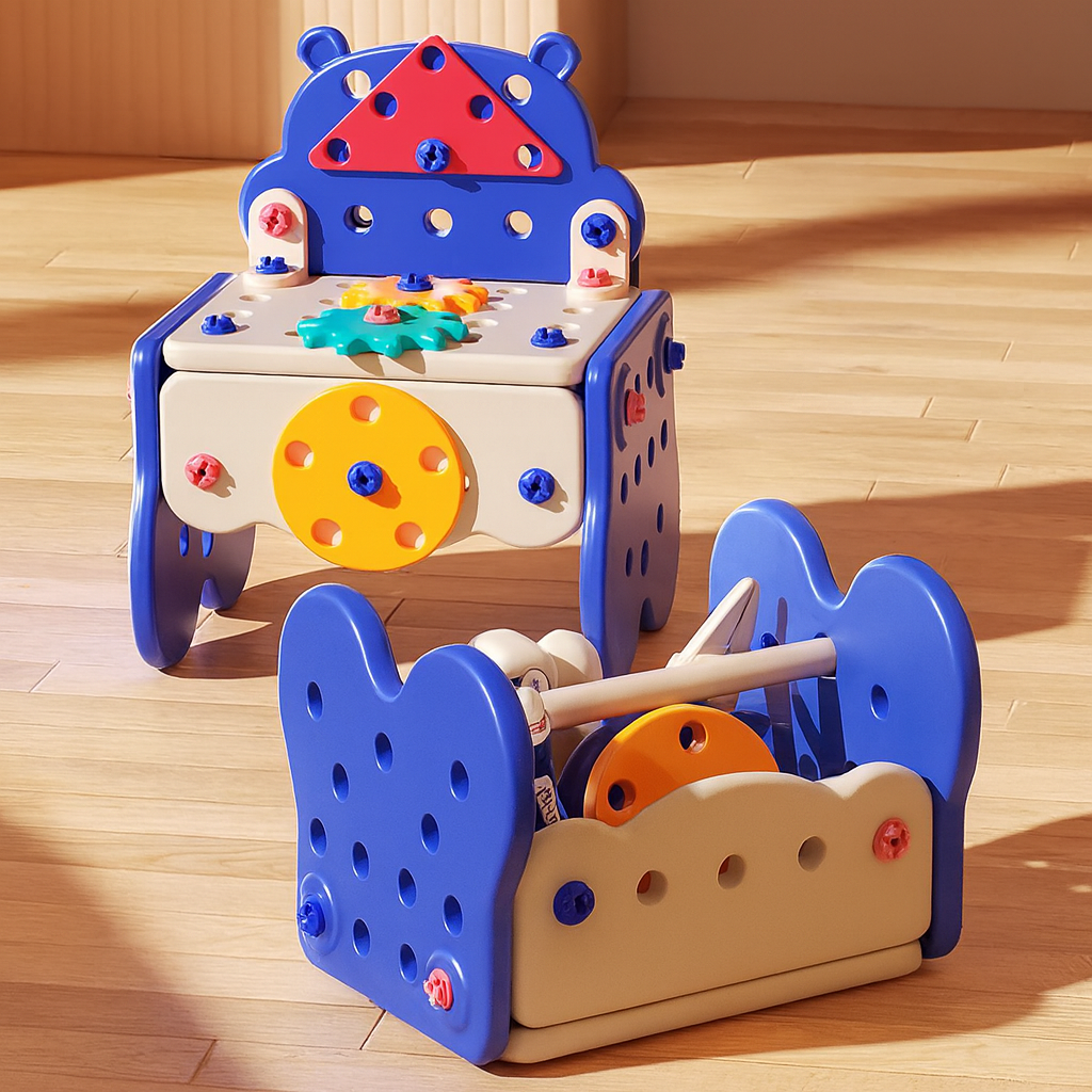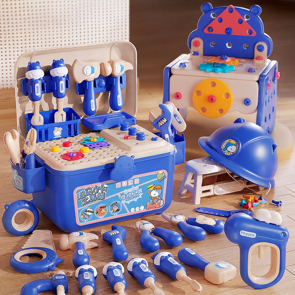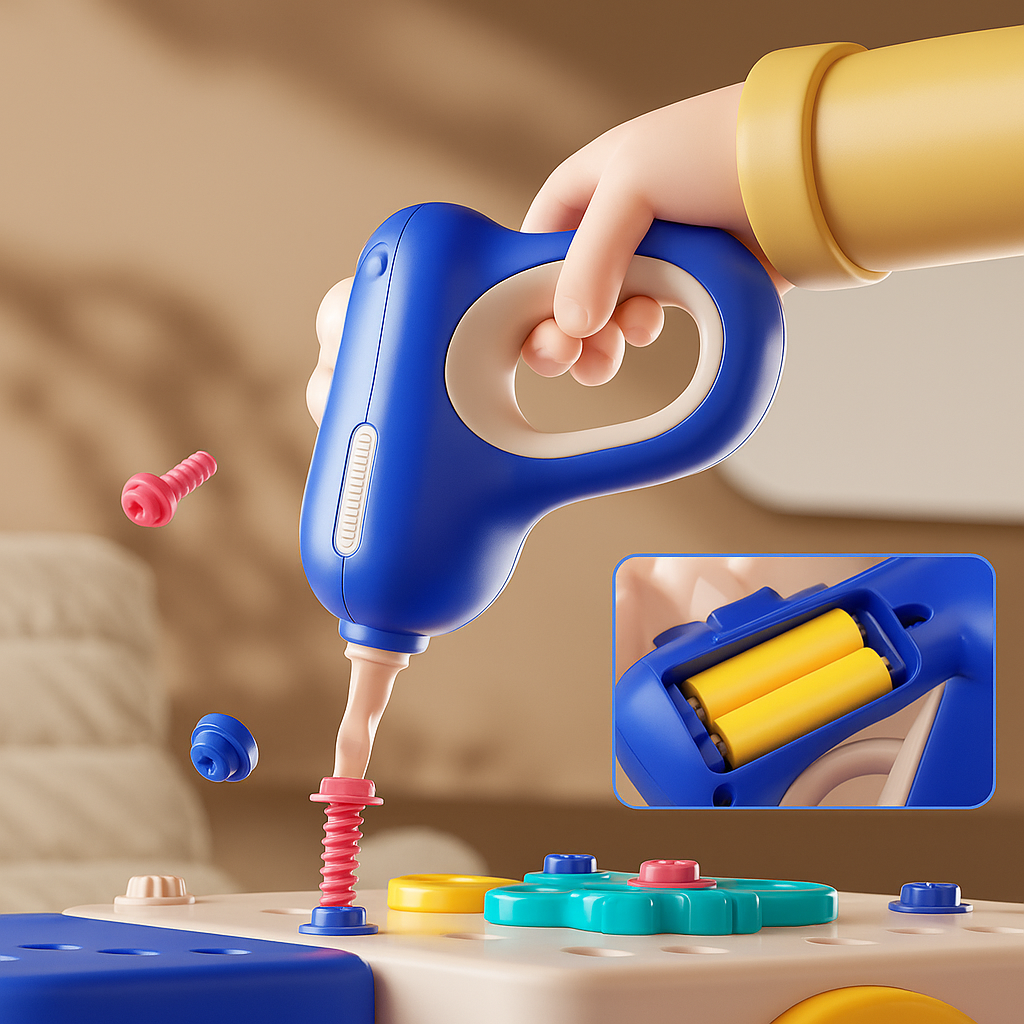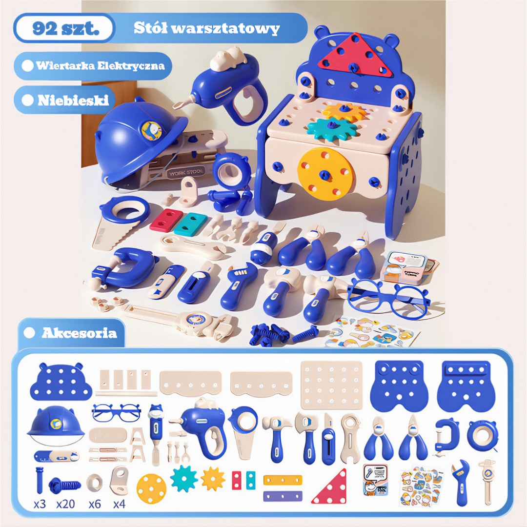 Poprzez różnorodność narzędzi, takich jak elektryczna wiertarka, młotek, śrubokręty czy klucz dziecko ma okazję tworzyć własne projekty, ćwicząc koordynację oraz poznając podstawy majsterkowania .