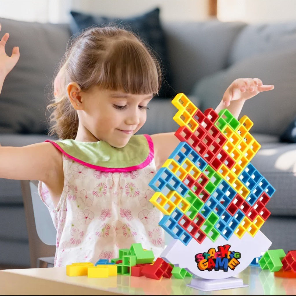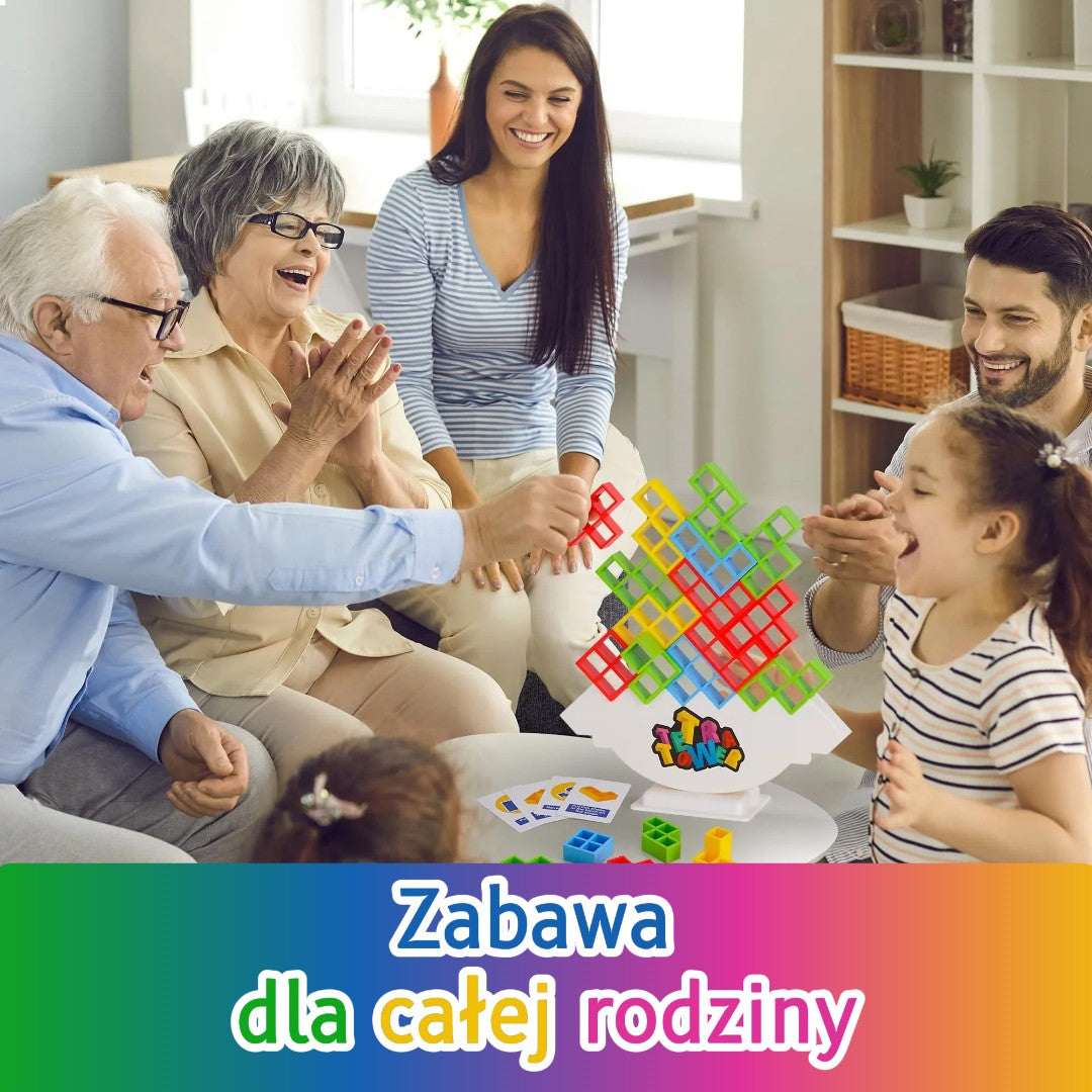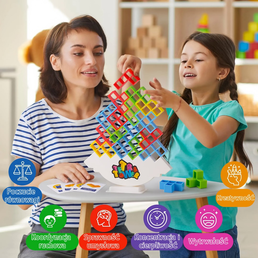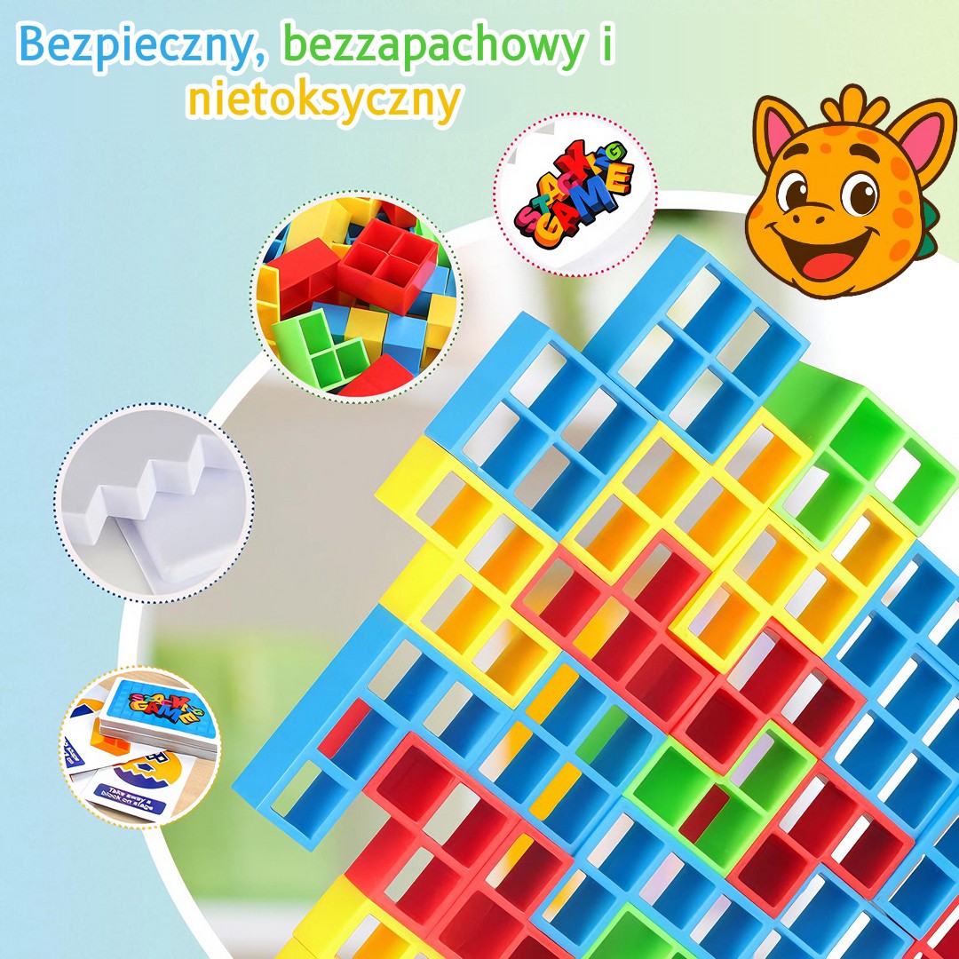 Poznaj wyjątkową grę zręcznościową, która dostarczy mnóstwo radości dzieciom i dorosłym! Kolorowe klocki w kształcie tetrisa trzeba sprytnie układać na balansującej podstawie – to wyzwanie pełne emocji, śmiechu i świetnej zabawy.