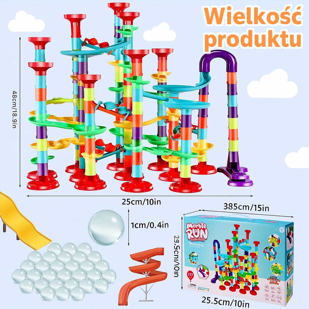 Zbuduj własny kolorowy tor kulkowy z zestawem DIY Construction Marble Run! To idealna zabawka edukacyjna, która rozwija kreatywność, logiczne myślenie i zdolności manualne dzieci.